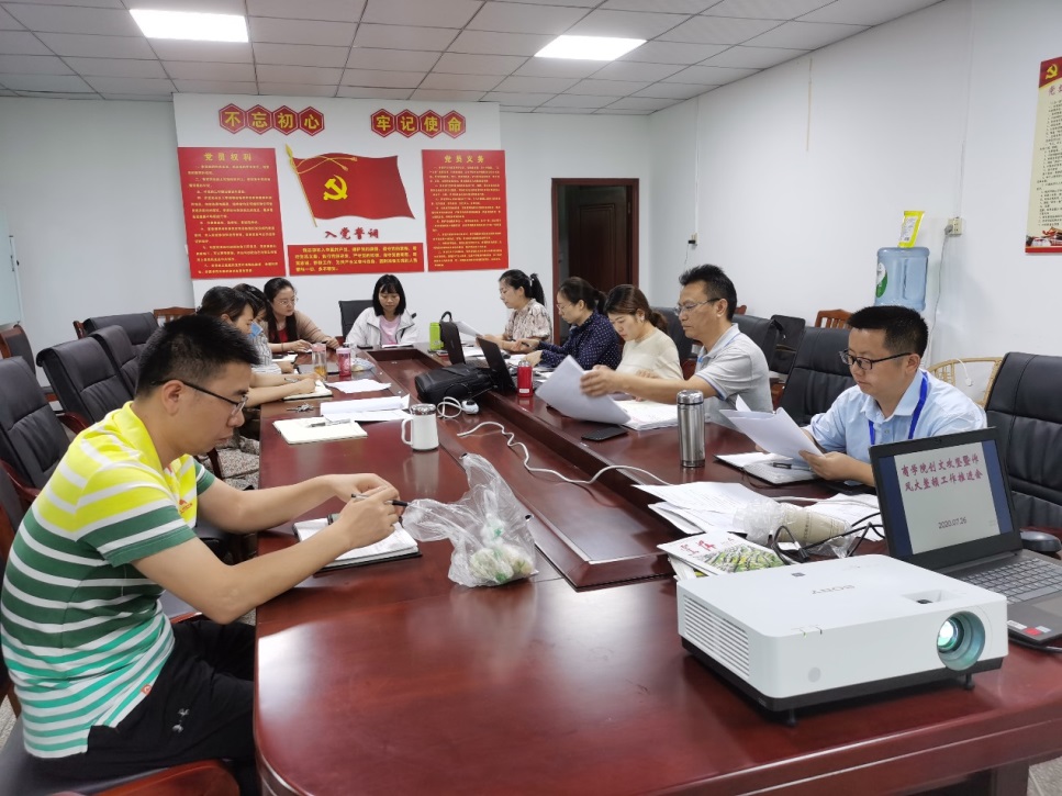 2020年7月26日上午,商学院在前期召开的创文攻坚暨作风大整顿工作动员会基础上,再次召开了工作推进会。商学院全体干部,党总支、党支部委员在党团活动室主会场参会,教职工通过腾讯会议参会,会议由商学院院长莫莉主持。