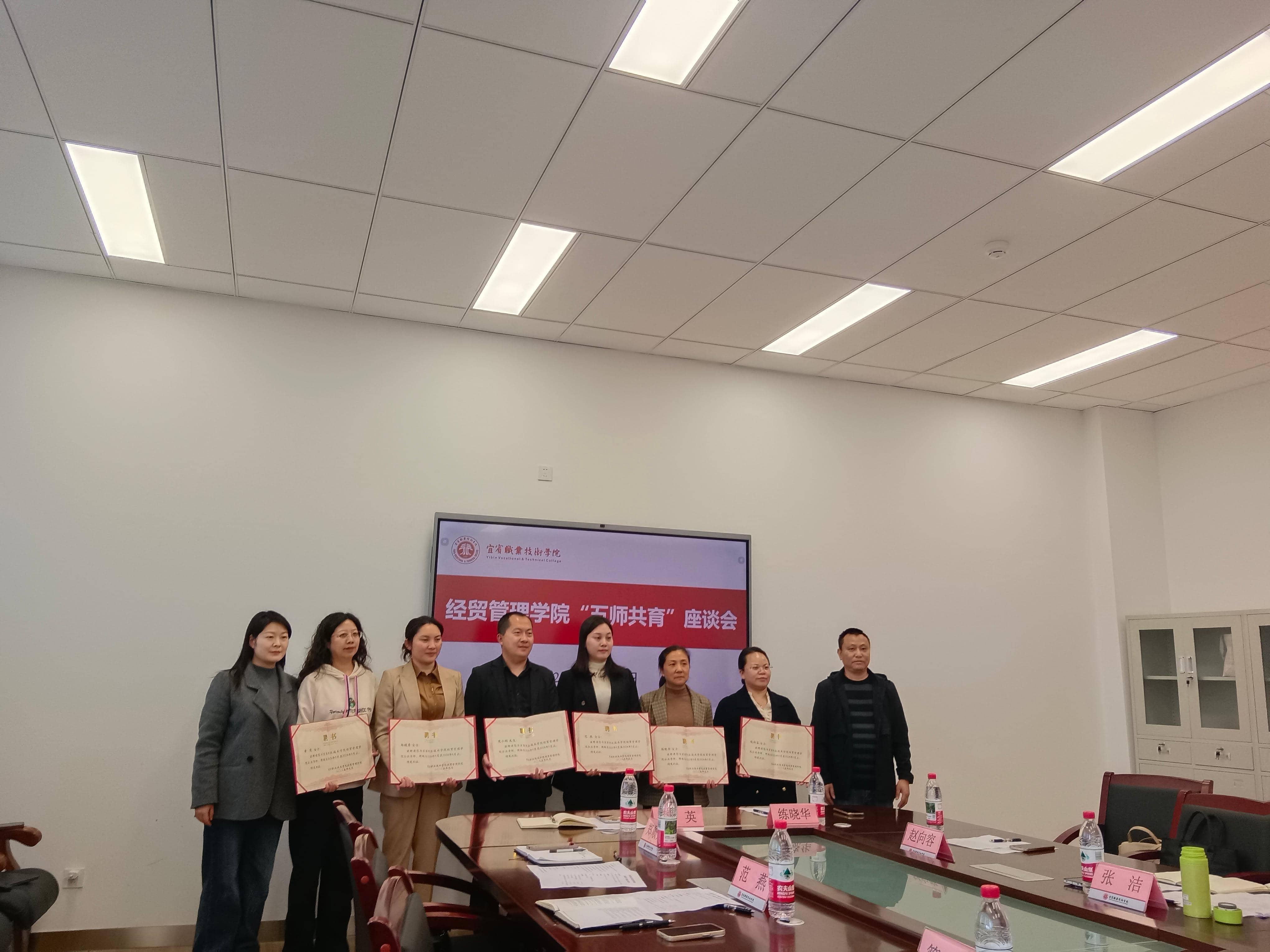 会议伊始,周杰书记首先对各位导师的到来表示热烈欢迎,并简要回顾了学院“五师共育”工作启动以来的总体进展。他表示,“五师共育”是学院落实立德树人根本任务、深化“三全育人”改革的重要抓手,经过前一阶段的探索实践,初步形成了多方参与、协同发力的良好局面。随后,经贸管理学院院长莫莉、党总支书记周杰共同向企业导师颁发聘书,感谢他们为学院人才培养注入优质行业资源与实践智慧。