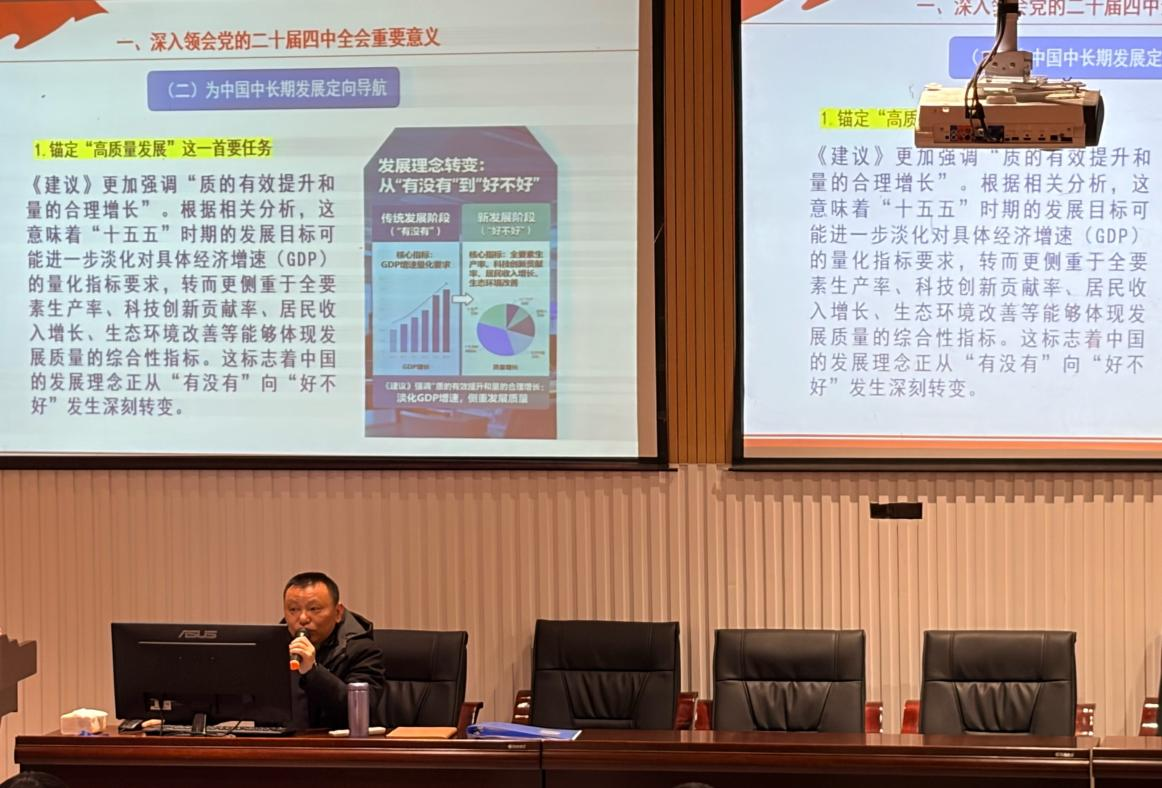 为深入学习领会、全面贯彻落实党的二十届四中全会精神,引导全院师生切实把思想和行动统一到党中央决策部署上来,2026年1月8日,经贸管理学院组织开展专题宣讲会。学院党总支书记周杰担任主讲,全院教职工及团学骨干共计150人参加学习。